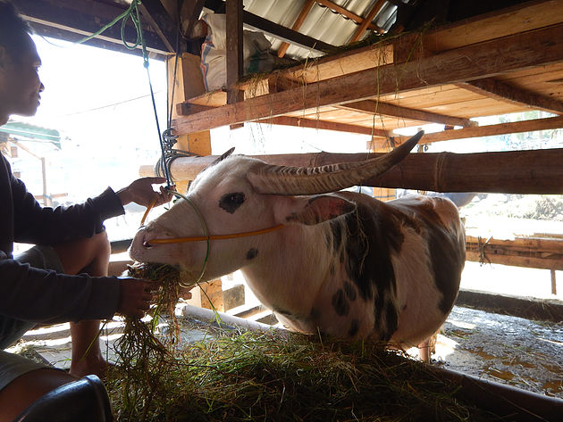 I didn’t know what it was when I first saw a little stone house with a door that would only fit a child in. I was told that graves here are built for an entire family. So every time a family member dies the door to this little stone house opens and the body is placed inside the room with the rest of their deceased family members. These graves are built everywhere and anywhere. They also have statues made to look like the dead. You can see these models of the dead bodies sat outside their graves, especially outside the caves in Toraja. Some caves are open for the public to walk around and it is fascinating to say the least. There are doors and statues all over these caves, symbolizing the entrance of a grave, which is a big hole full of coffins. Even the animals you see here play an important role in Toraja’s culture. You cannot turn a corner without seeing a buffalo. Buffalos are very important, as they are the symbol of prosperities. They have a very important role in funerals, as they are sacrificed for their strength. It is believed that buffalos will use their strength to lift the gates to heaven for the body to pass through. Class and family affiliation still exists in Toraja so sometimes a high-class family must sacrifice twenty-four buffalos at a funeral ceremony. However, the type of buffalo a family has is the most important, as their characteristics define how much they are worth. For example, the light skinned buffalos are the most expensive and a family must be very wealthy to afford one of these. The price ranges because of a buffalo’s horns and the colour of their skin.